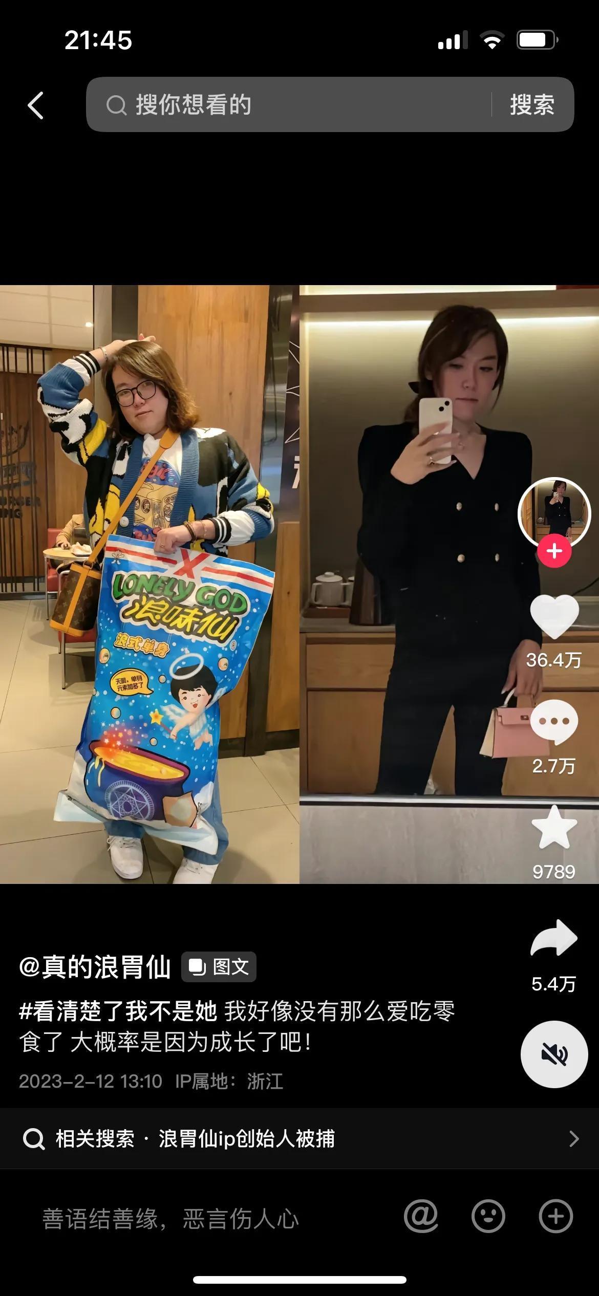 网红超级大胃王浪味仙,之前是个接近150斤的结实小伙。在最近的晚会现场,他成功减肥瘦身70斤,穿着黑色的晚礼服,一举一动之间,女人味十足。