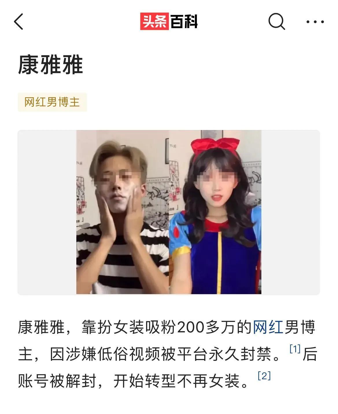 网红康雅雅是一位靠着变女装出名的百万博主。日常会给网友们变装白雪公主、甜萌妹子、制服穿搭。深受网友喜爱。