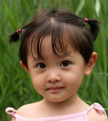 头发少少的短发小女孩,有着一张天使一般的面孔,将短发一分为二后,在头顶两侧边扎成简单的双丸子型发髻,比低调的双马尾辫好看时尚很多哟,也显得小女孩娇俏灵动。