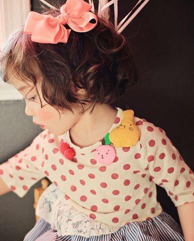 自然卷发小女孩美萌极了,卷曲的发丝梳理成斜刘海造型,环绕着稚嫩可爱的小脸,在一侧边上方用丝带扎一个小马尾辫,这样女孩的短发就不显得那么的单调了呢。