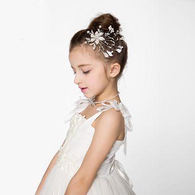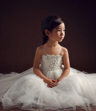娴静温婉的十岁女孩梳着黑色长直发,偏梳的刘海紧贴额头向侧边梳理,其余长发向后梳理光滑,并编织成蜈蚣辫,垂落在背后,穿上公主裙,小女孩好优雅好有气质。