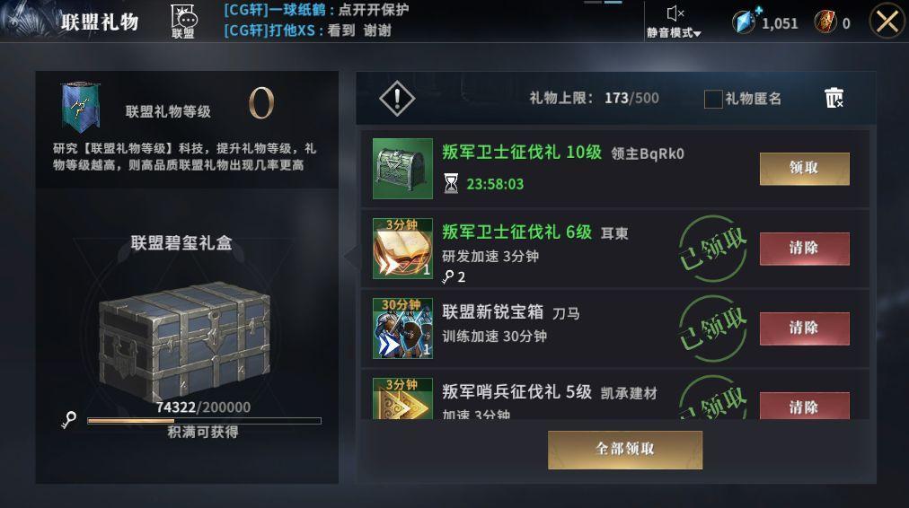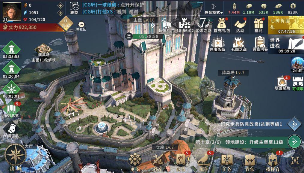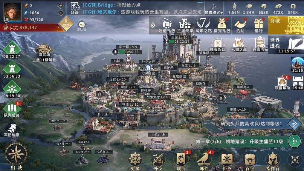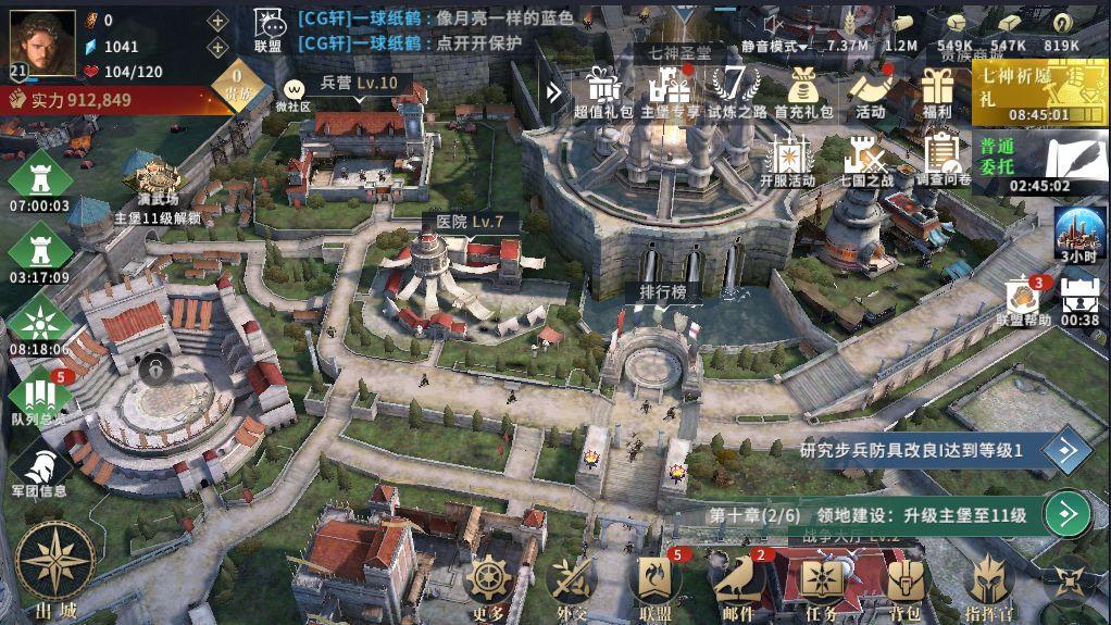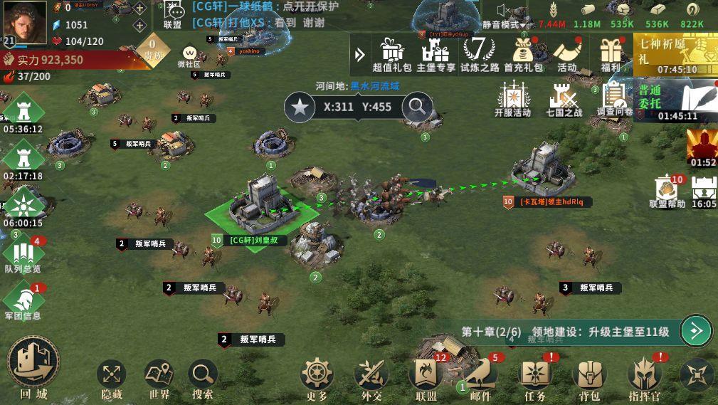 10级差不多做完前九章剧情任务,然后把所有的建筑能开的都开了,攻打下来的领土能建的都建了。我们再进行下一步发展,一定要先加个联盟,加联盟玩家能够与联盟互相帮助,减少发展时间,联盟成员攻打野外叛军,自己也有礼包拿,并且奖励非常的丰厚。