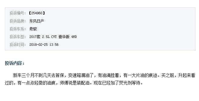 那么如今变速箱漏油问题是否还是新奇骏的致命缺点呢?之前旧款奇骏CVT变速箱漏油,而现款的依旧搭载的是CVT变速箱,不过进行改款之后相信日产已经能够解决这个问题了。只是不幸的是2017款新奇骏也有车主投诉变速箱漏油的问题,这是否是普遍的问题,我们还需要时间验证。