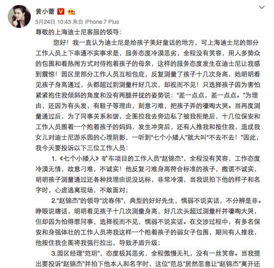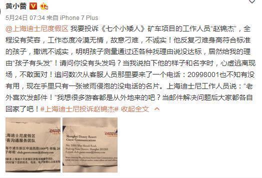 这下惹怒了黄小蕾。并在微博上连发两条微博投诉上海迪士尼《七个小矮人》矿车项目的工作人员。而为什么要选择在微博上公开投诉,第一条微博黄小蕾就说明了情况,并不是仗着自己的明星身份,是上海迪士尼并没有直接有效处理投诉的地方,只有邮件回复这一种途径。