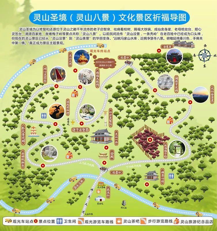 灵山古时松柏参天,奇花异木,灵禽怪鸟遍于山野。山中名景梅子岭、舍身崖、看柏树、牛犊泉与寺内铁佛、大锅、卧佛像、老母亭共称八景。每年四月初一的会期人山人海,香火鼎盛,久为西府名胜之首。