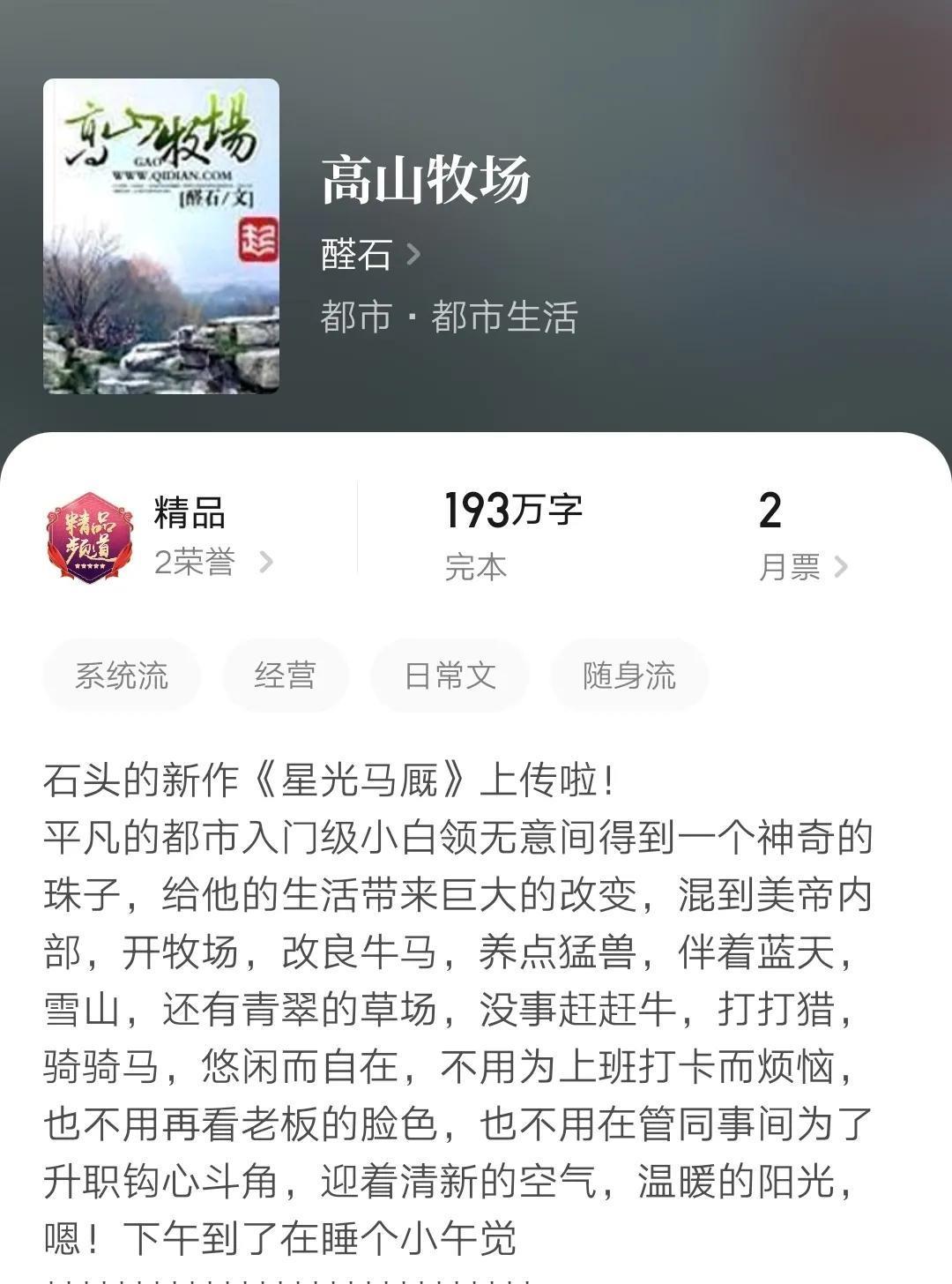 早期牧场种田流佳作,读后极度舒适。亲情友情娓娓道来,奇遇美景一一展现。