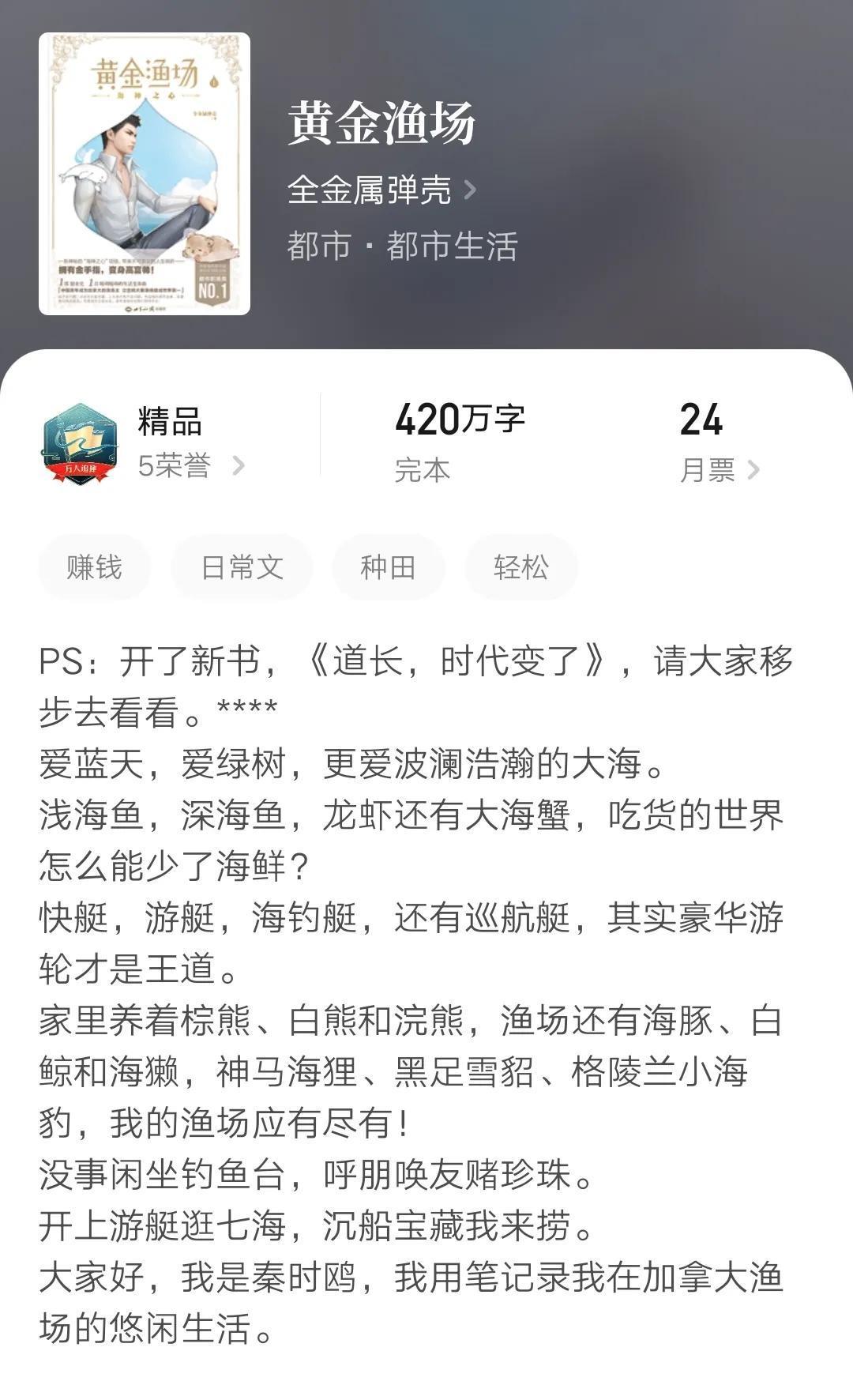 这也是一本时间比较久的种田文了,不是一般的种地,而是一个很棒的海洋种田文。而作者全金属弹壳在这本之后,也创作了很多种田小说,比如名字类似的《黄金渔村》等。