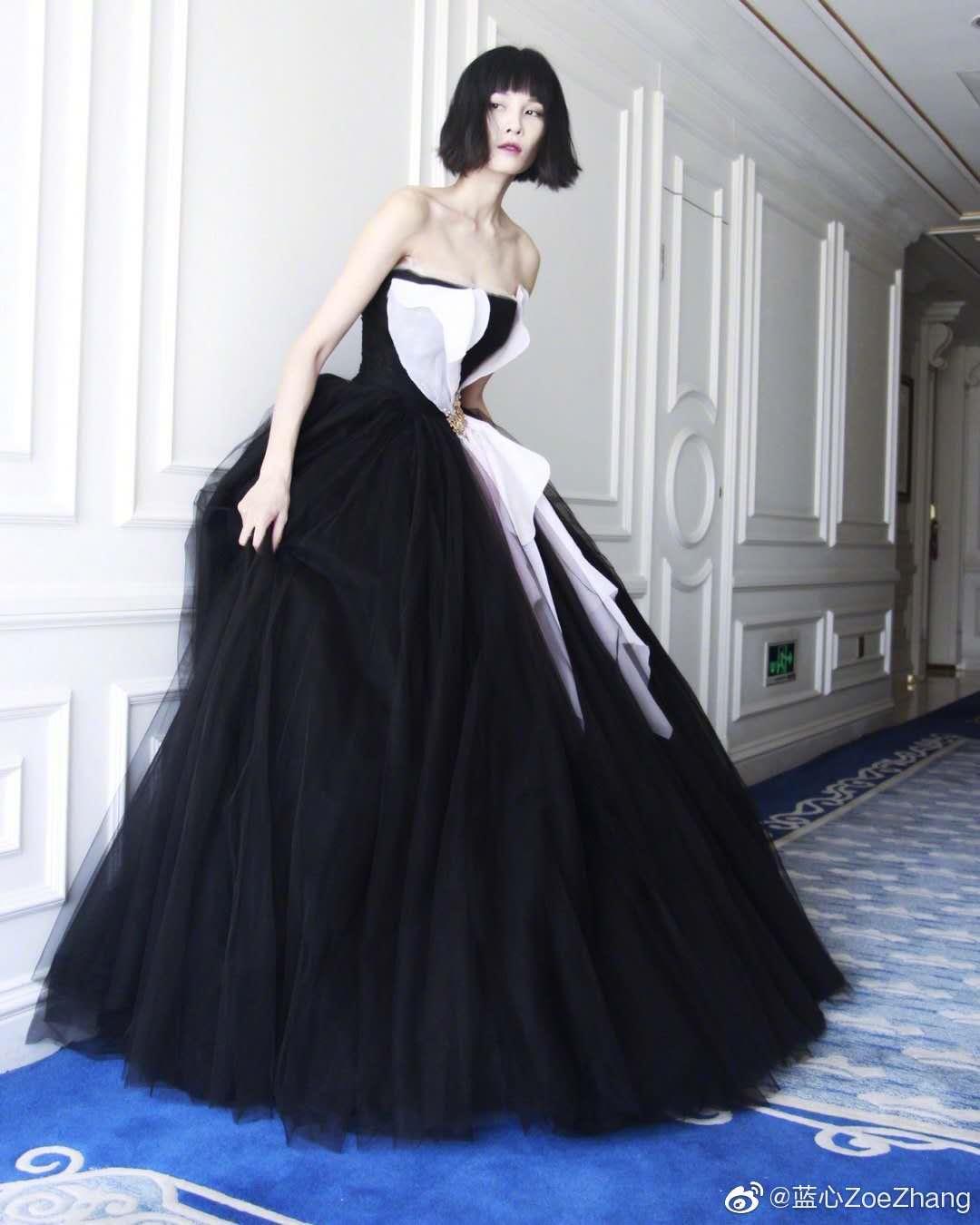 首先就是一个礼服的造型其实这个造型是之前的造型了,但是因为真的非常的个性和帅气不得不拿出来单独说一下,首先就是颜色上的选择,黑色的礼服和白色的礼服非常的常见,但是做了非常少女的款式但是又选了非常简约的颜色搭配,这样的造型其实相对来说还是比较少见的,首先就是颜色的选择把黑色做为了主要的颜色但是如果纯黑色可能会让整个造型看上去相对来说比较低沉锁在上半身还巧妙的加入了白色的元素,可以让整个造型看还上去相对来说比较的立体同时也会更加的又设计感了,同时裙子的材质并没有选择非常常见的缎面的材质和元素,而是选择了多层的薄纱元素,整个造型都是非常少女的款式,相对来说就能打破黑色带来的沉闷感,搭配了张蓝心的短发,加入了小小的俏皮的元素就可以让整个造型视觉上更加的少女和灵动了