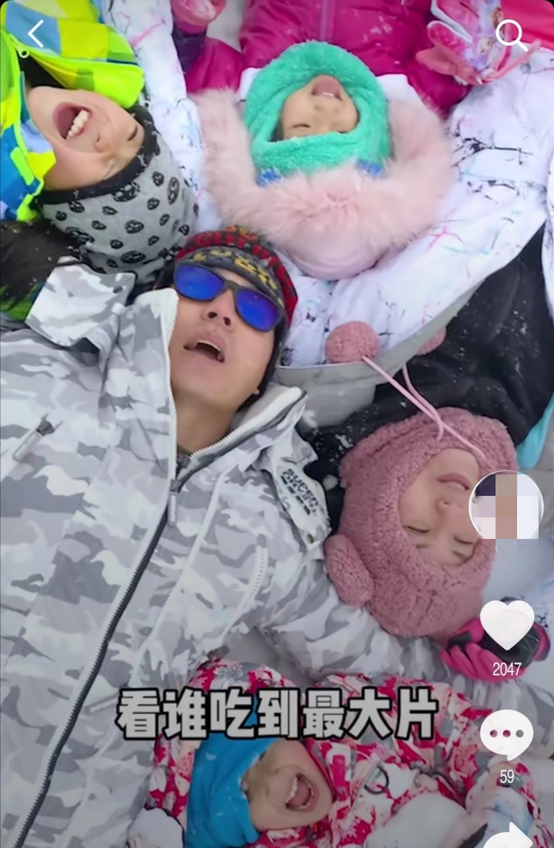 一家五口经常会一起外出游玩,冬天的时候还会一起躺在雪地里吃雪,画面十分温馨有爱。
