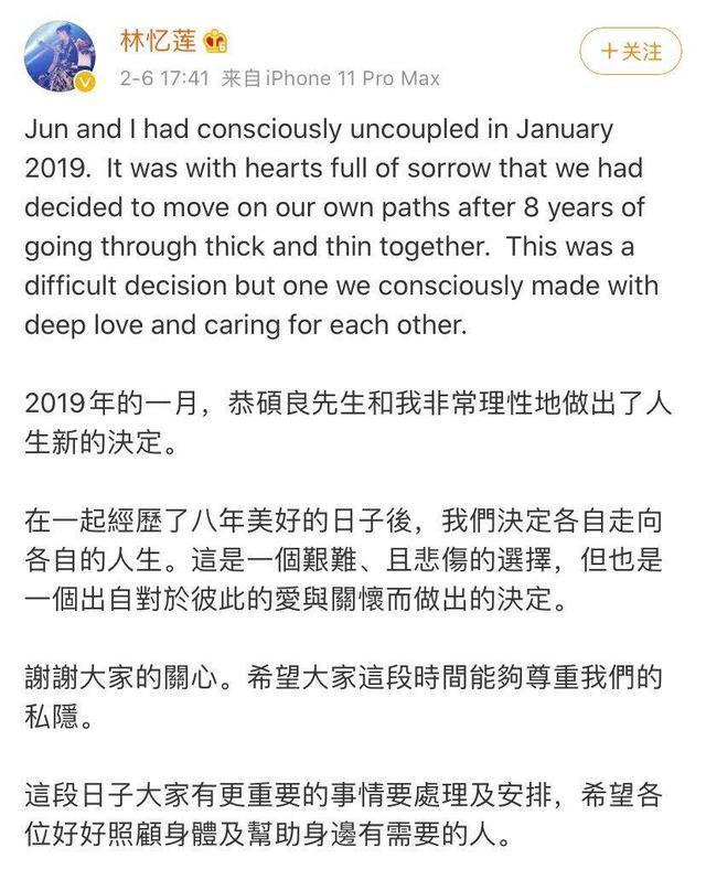 可惜这段感情维持了八年,最终二人还是选择分手,其实林忆莲在这次感情中付出了很多的,因为上一次的失败婚姻,所以这次为男友可以说是全心全意付出的,可惜恭硕良太花心了,经常出入酒吧,还与多名女子有暧昧关系,虽然开始为了感情选择了原谅,但男友一而再再而三地背叛自己,不得不作出分手决定。