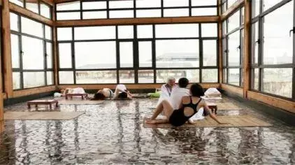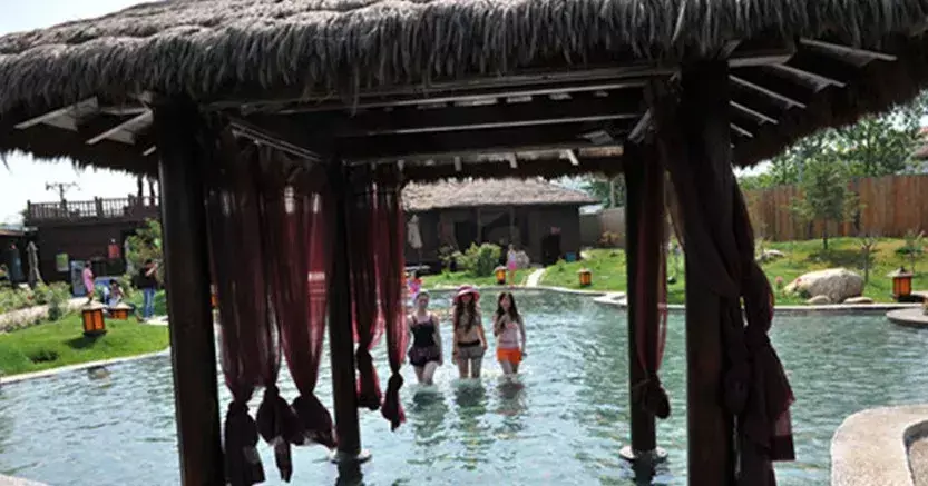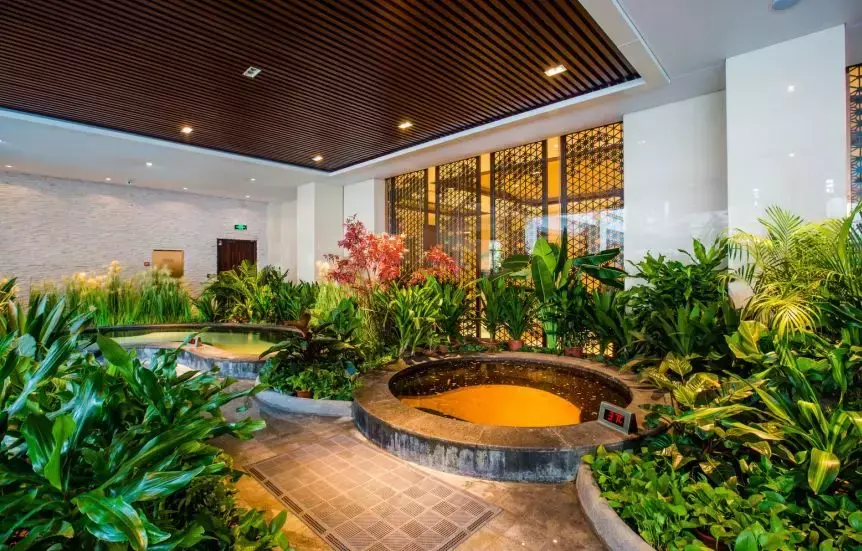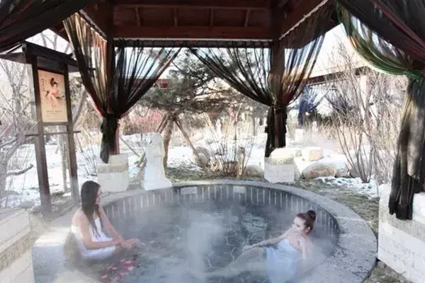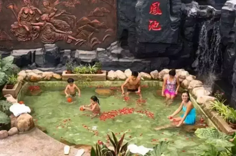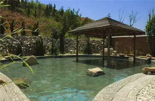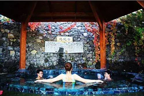 温泉水中含有钙,纳,锌等多种对人体有益的微量元素,对于关节炎,神经痛,过度疲劳等有明显功效。温泉会馆有室内泡池30多个,并且有玫瑰浴,果蔬浴,鱼疗等多种功能疗养池,整个温泉会馆可容纳千人同时洗浴。