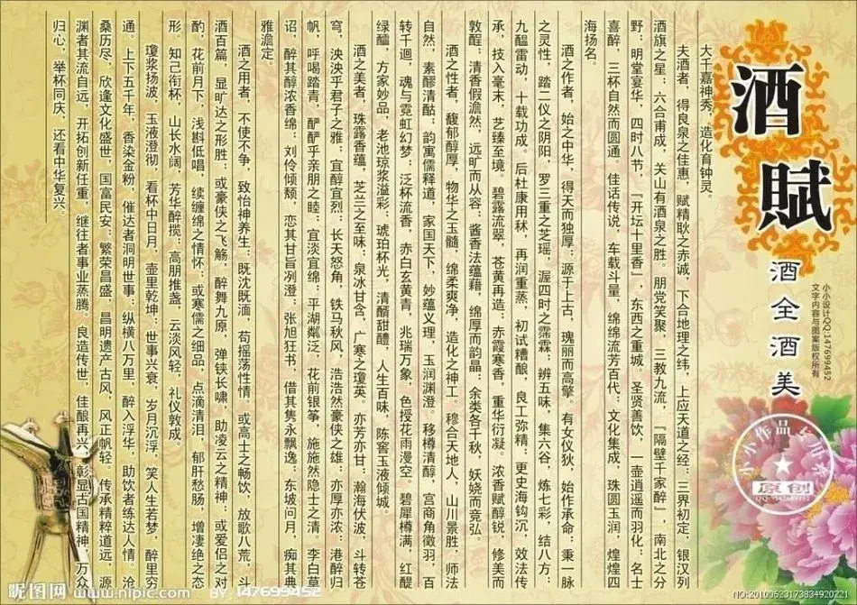 乾坤烁烁,日月朗朗。龙腾华夏,天地呈祥。红尘锦绣,酒风浩荡。神州巍巍,福泽绵长。街馆楼肆,酒旗飘扬。四季合时序,五谷酿琼浆。仙侠善吸鲸饮,雅士举杯流觞。岂可无酒赋乎?作之。