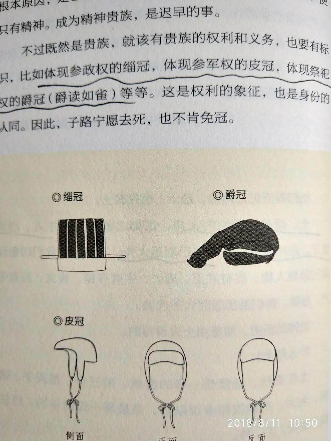 厦门大学教授易中天在《易中天中华史.奠基者》中说:古代冠礼“加冠”一共三次。第一次加“缁冠”,这是用来参加政治活动的。第二次加“皮弁”,这是猎装和军装(正卒),所以同时还要佩剑(挎箭)。第三次加“爵弁”,这是用来参加祭祀活动的,又叫“宗之冠。”