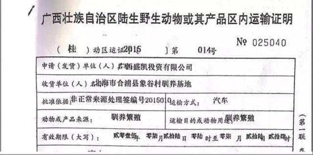 广西盛凯投资有限公司取得的野生动物运输许可证,用于向基地运送穿山甲。