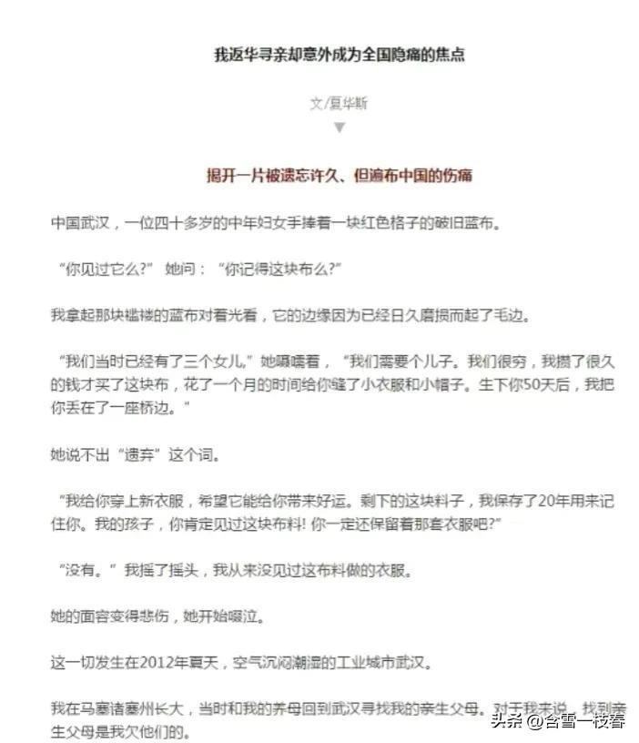夏华斯回到美国后,将这几年寻找亲的经历写成了纪实文字发表,其中有段文字是这样的: