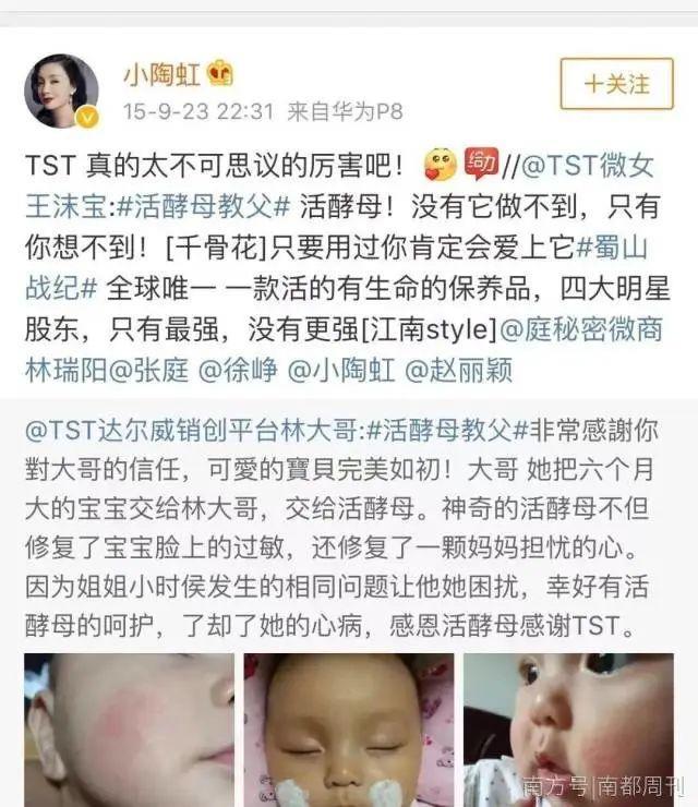 陶虹挺享受推广TST的,不遗余力地在微博宣传,说:“TST真的太不可思议的厉害吧!”、“丰富精彩有爱的TST一家人!”,这话术确实很微商。