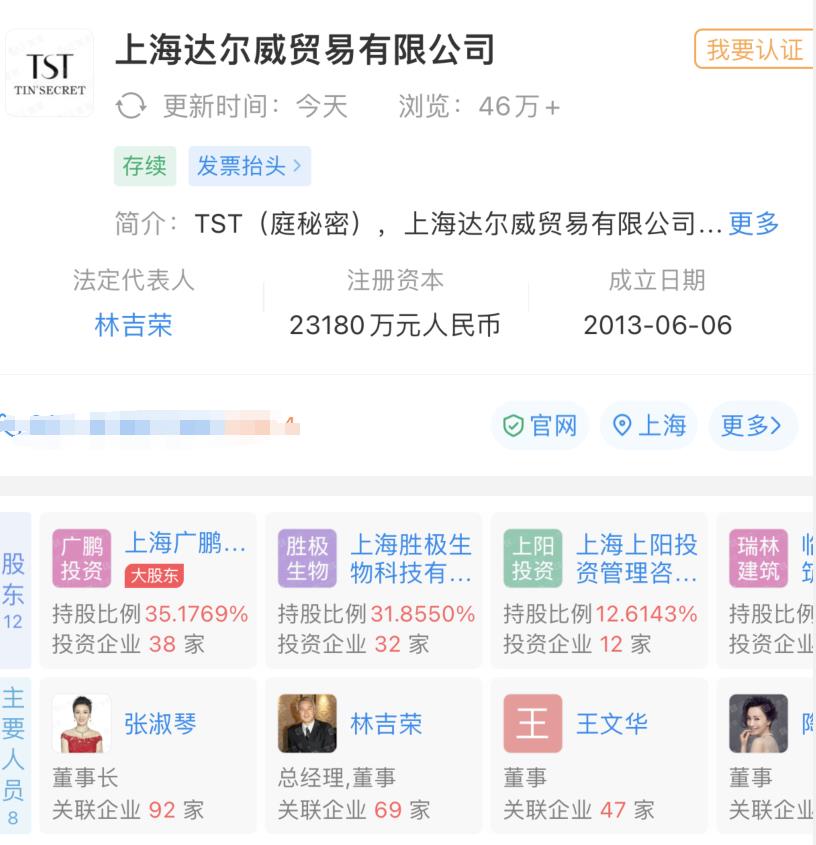 公开信息显示,上海达尔威贸易有限公司注册资金23180万元人民币,法定代表人为林吉荣(即知名演员林瑞阳),公司旗下拥有日化用品品牌“TST庭秘密”。