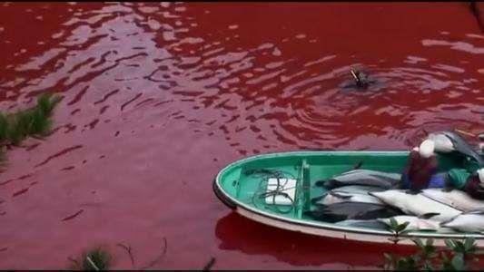 这些渔民会直接在水里把海豚刺死,镜头从高处网下拍摄到的整个海湾血色一片。