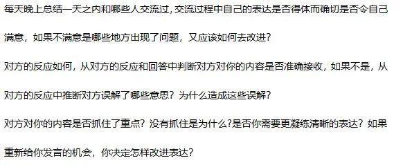 因此需要我们多与人沟通交流,在日常生活中珍惜和认真对待每一次和别人表达自己的机会。把每一次交流当成一次练习来认真对待,并在交流中不断总结提高及时复盘。