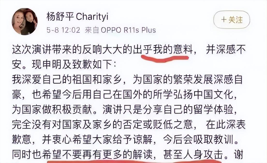 如果不是亲耳所闻,台下观礼的华人和留学生,很难想象这些辱华言论竟然出自中国人,杨舒平做完演讲以后,马里兰大学校长以及美籍学生都爆发出热烈的掌声,而中国人看到这一幕纷纷眉头紧皱,不敢苟同杨舒平的言行,随后她的演讲视频被发布在各个社交平台上,杨舒平因为有争议的言论瞬间爆火网络,行为引起公愤。