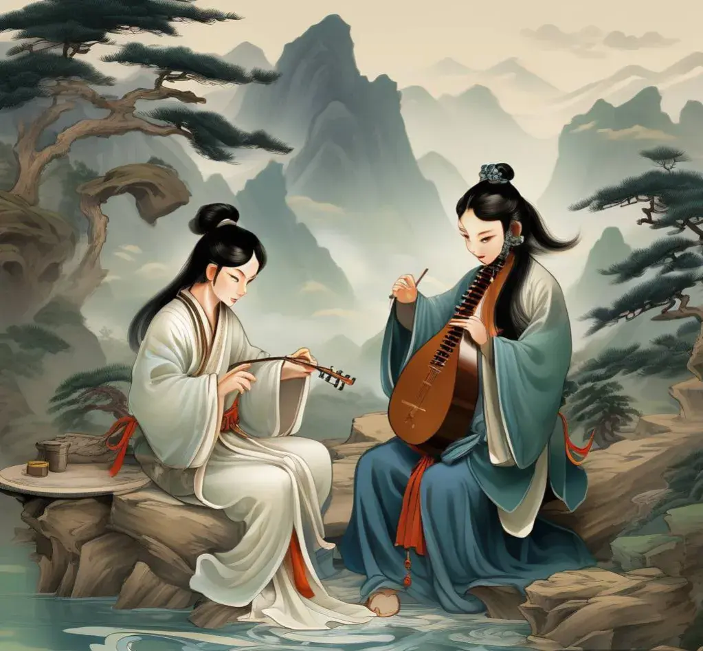 上联:“高山流水觅知音,琴韵悠扬随风传。” 这里“高山流水”既指自然景观,也暗喻了伯牙与子期的故事,表达了寻找知音的愿望。伯牙善鼓琴,子期善听,二者相遇,高山流水成为了千古佳话,象征着知己难求。“琴韵悠扬”形容琴声优美,随着风传播开来,形象地描绘了音乐的美妙和传播的广泛。