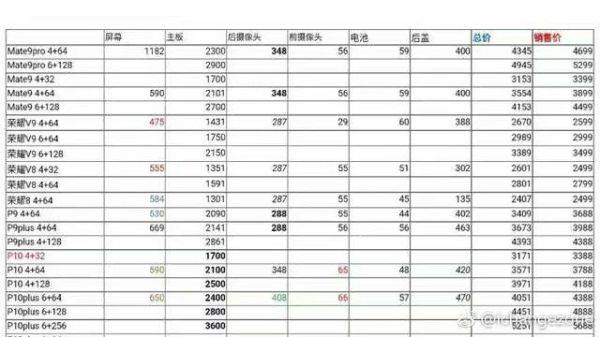 事情至此便已经说得通了,该网上曝光的图表并非传言的“华为手机成本”表,而是“华为手机非保修常用维修配件参考价”表。对于华为P10来说,该图中的“总价”高仅意味着该手机的维修价格高,“零整比”高,而其手机的单纯物料成本远没有这样高。