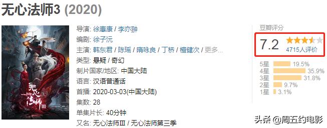 现如今在新剧锁分已成为“行业习惯”的环境下,《无心法师3》早早放出评分的做法反倒有些出乎意料,豆瓣7.2算是近期新剧中相当不错的分数了。