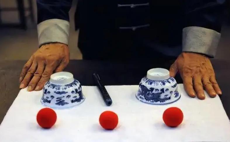 艺人利用快速变换的巧妙手法,使得三个球在两个碗之间来回变换。