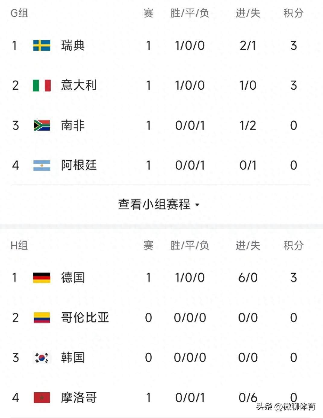 我们把视线转移到G组,意大利和阿根廷相遇,这一场比赛,两队的对抗很激烈,意大利20次犯规,阿根廷16次犯规,意大利拿到了2张黄牌,阿根廷领到了4张黄牌。运气站在了意大利这一边,下半场第87分钟,替补球员吉雷利头槌破门,攻入了全场唯一进球,1-0锁定胜利。意大利和瑞典两支欧洲球队都是以绝杀的方式拿到3分,占据小组前两名,掌握出线主动权。