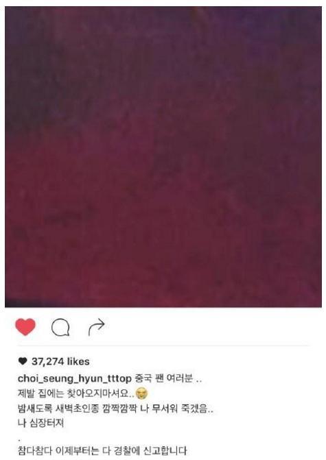 TOP曾经饱受私生饭的困扰,公开在instagram上写到“拜托中国粉丝不要来我家了,凌晨的时候太吓人了,我很害怕,我的心脏要爆炸了!”但是这条状态随后就被TOP删除了。