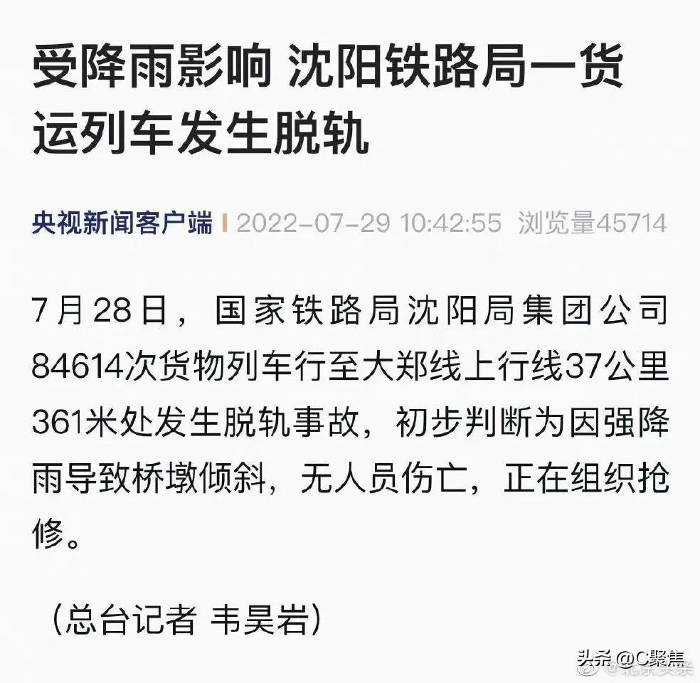 2022年7月29日 ,央视新闻报道,受强降雨的影响,国家铁路局沈阳局集团公司一货运列车发生脱轨事故,事故原因为强降雨导致桥墩倾斜,所幸无人员伤亡,更幸不是客运列车发生脱轨事故。