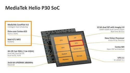 Helio P30基于16nm制程,相较Helio P25省电8%,效能更出色。CPU采用8颗Cortex-A53核心,主频达2.3GHz,支持联发科CorePilot多任务演算技术,兼具高性能和低功耗。
