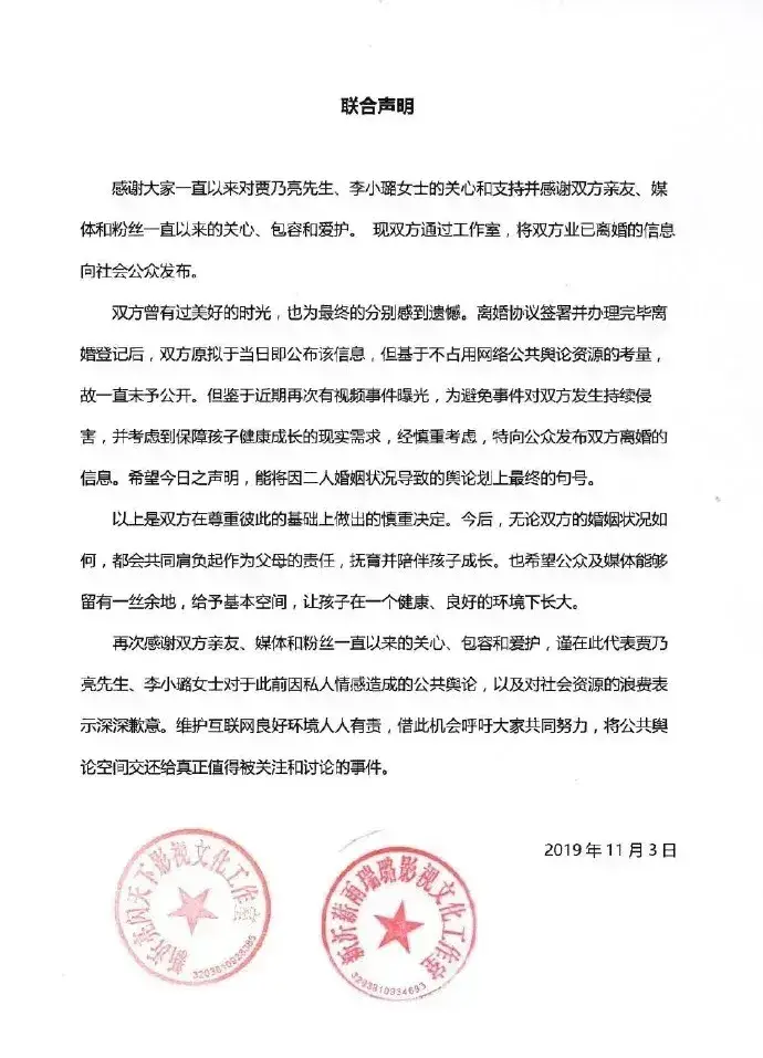 今晚贾乃亮与李小璐离婚,并表示“今后将共同肩负起作为父母的责任,赋予并陪伴孩子成长。”