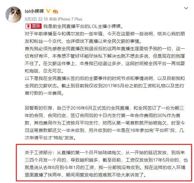 关于工资部分:从直播的第一个月开始陆续拖欠,从一开始的延迟发放,到后来三四个月发一个月的,导致越积越多,截至目前,工资仅发放到17年5月份的,也就是说从去年6月到今年1月的工资,我一分都我没有收到。我在这样的收入环境里面直播了快两年,期间用爱发电的艰难就不给大家诉苦了。