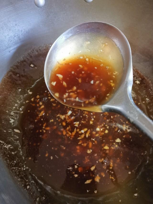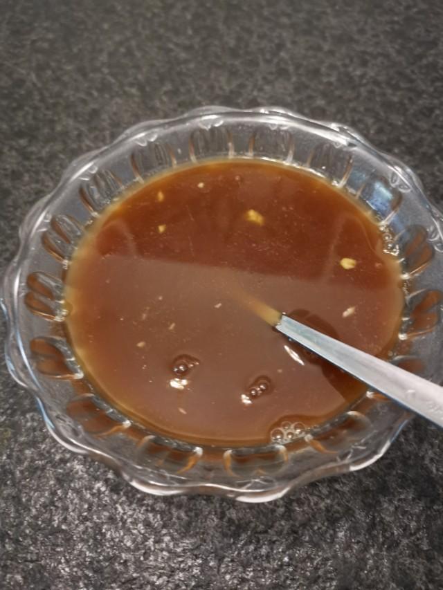 一勺蒜末、少许盐、两勺生抽、一勺蚝油、半勺米醋、半勺白糖、少许鸡精、一勺玉米淀粉、半碗清水,搅匀。