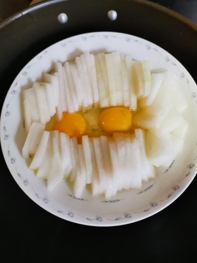 第一步:切好的冬瓜片摆入盘中,中间打入两个鸡蛋,上锅蒸熟。