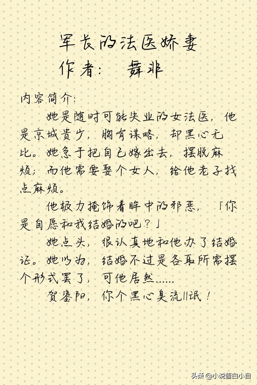 小自短评:本文开始是由男主和女主斗智斗勇的展开的,女主是随时可能失业的女法医,男主是京城贵少,两个人都有结婚的念头,然后开始了先婚后爱的故事。