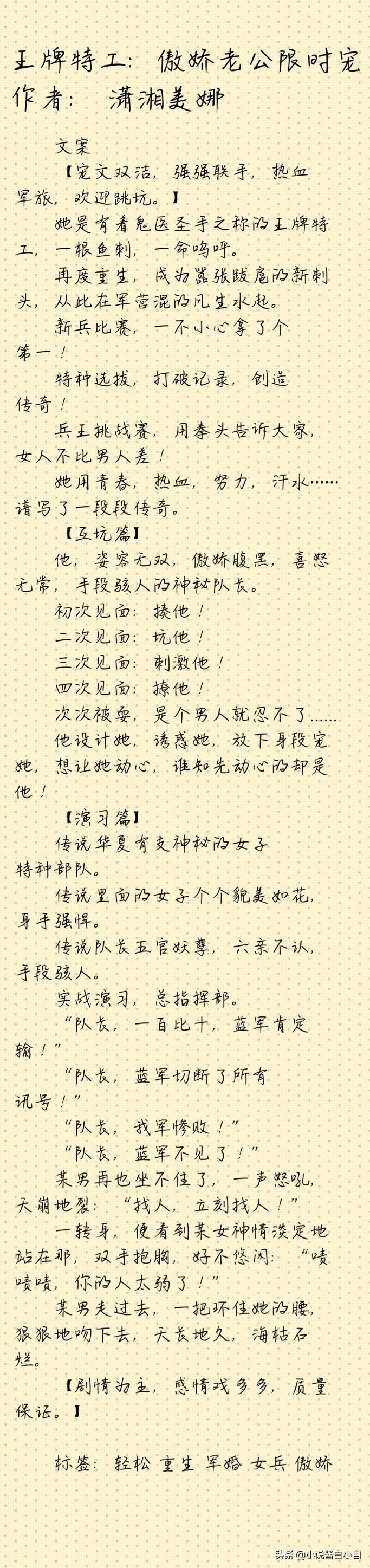 小自短评:本文属于军婚宠文,男主女主都是军官,两人强强联手,热血军旅,傲娇女兵重生在军营里混得风生水起。