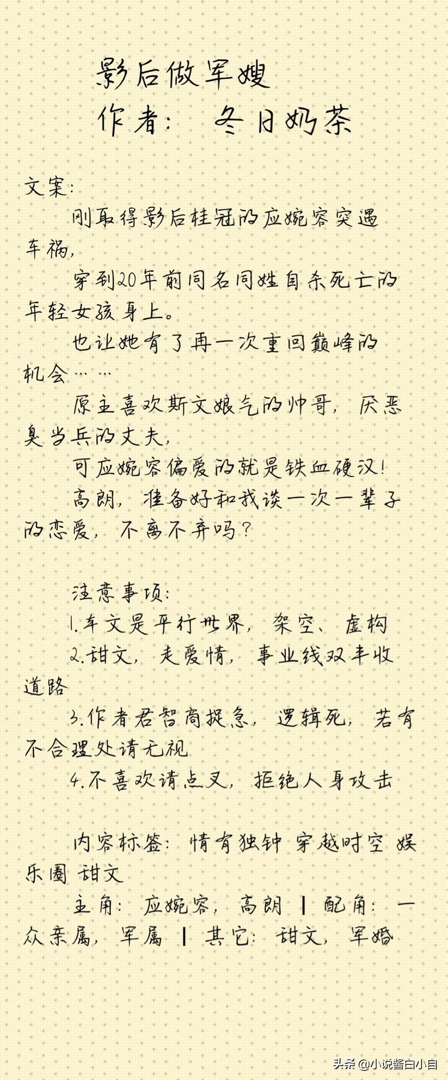 小自短评:本文属于架空年代,影后重生在自杀死亡的女主身上,有一个铁血硬汉男主老公,甜文,走爱情,事业双丰收的路线。