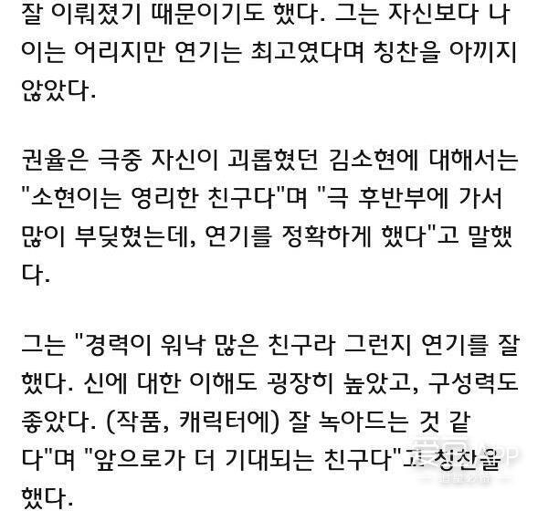 权律对于剧中曾受到自己的折磨的金所炫说道:“所炫是很聪明伶俐的朋友,在剧后半部分的走向中有很多的碰撞,很准确地诠释了演技。”
