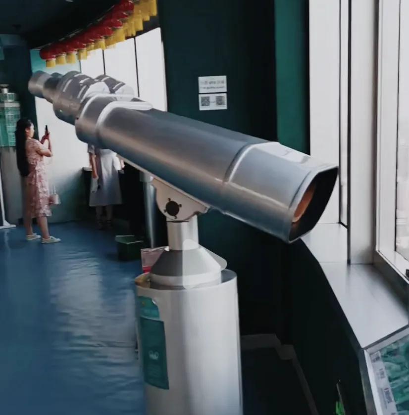 有望远镜可以观看。望远镜要另外出钱买币,2块钱只能用一分钟的样子。说是6架高倍望远镜,可南眺香港。