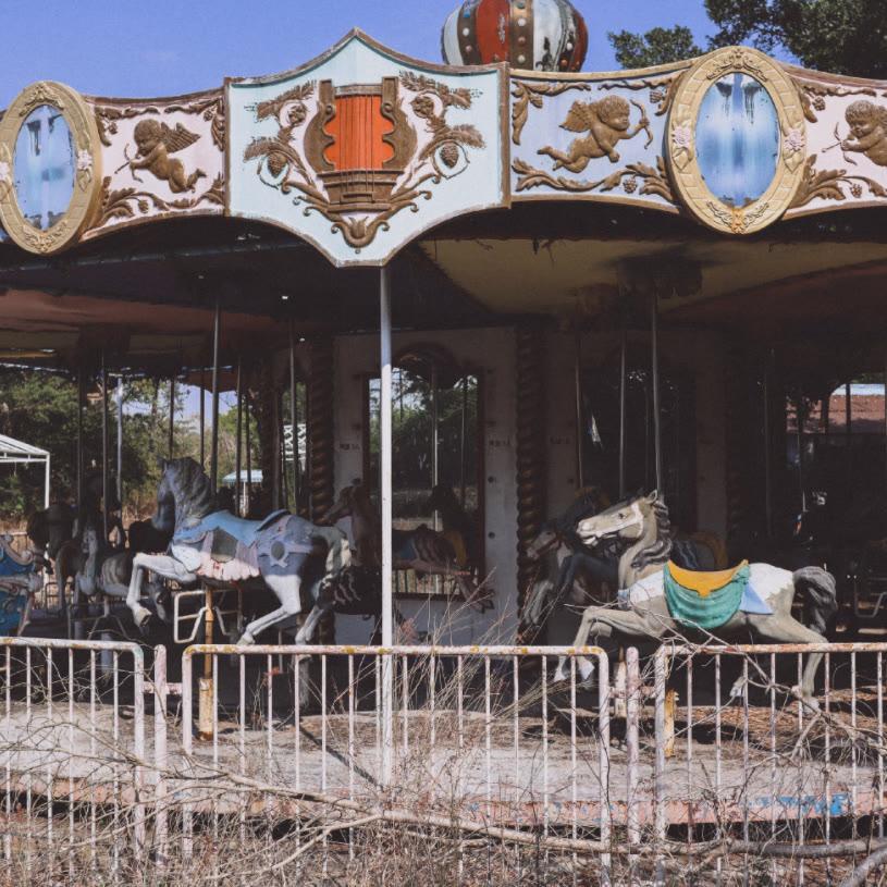 旋转木马再也不会转了,已经长满了树根,曾经的小孩子欢乐的笑声,木马也静止了,可能在晚上的时候,这些木马上都有曾经快乐的精灵在玩耍,感觉它们是如此的孤独啊!