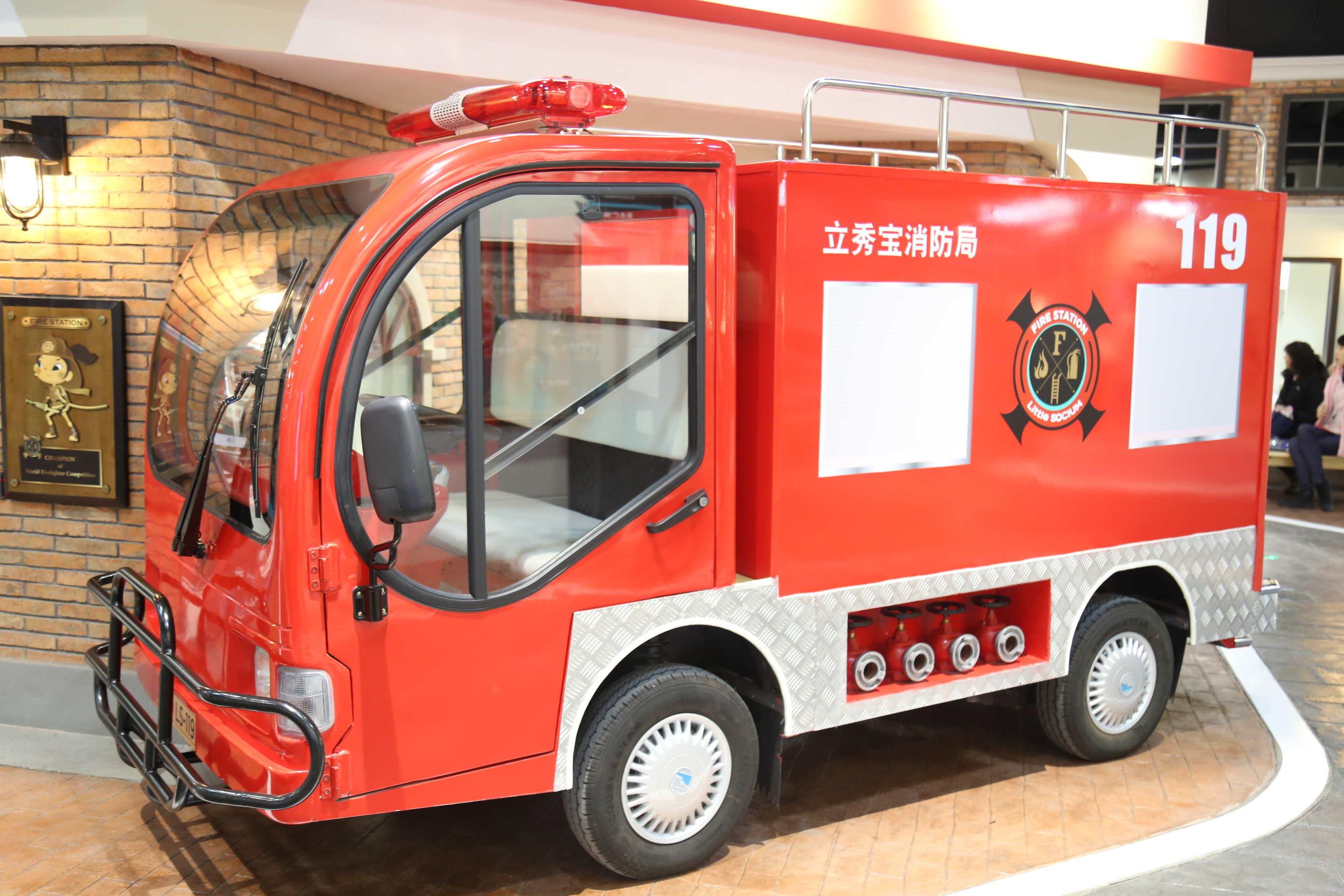 滑降车库,消防车会拉起警报绕场一周去到火灾现场,到了火灾现场后,小乐宝们每人负责一个喷水枪,扑灭对面“大楼”里的火灾。