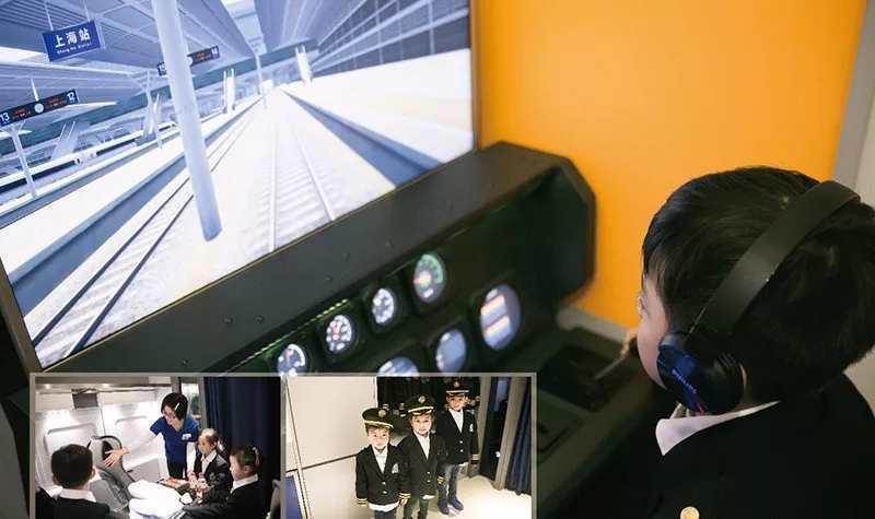 这个场馆里可以体验2种不同的职业:高铁驾驶员和乘务员。换好衣服在驾驶座上坐好后,乐宝会帮助小朋友戴好耳机,跟随耳机里的指令推送右手边的操纵杆,屏幕上就能看到火车发车啦!