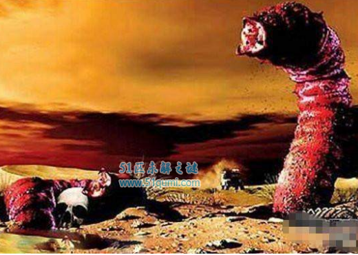 蒙古沙漠常有一种巨大血红色虫子出没,它们形状怪异,会喷射出强腐蚀性剧毒液体,另这些巨大虫子还可从眼睛中放射出一股强电流,让数米之外的人或动物毙命,然后将猎物慢慢地吞噬。