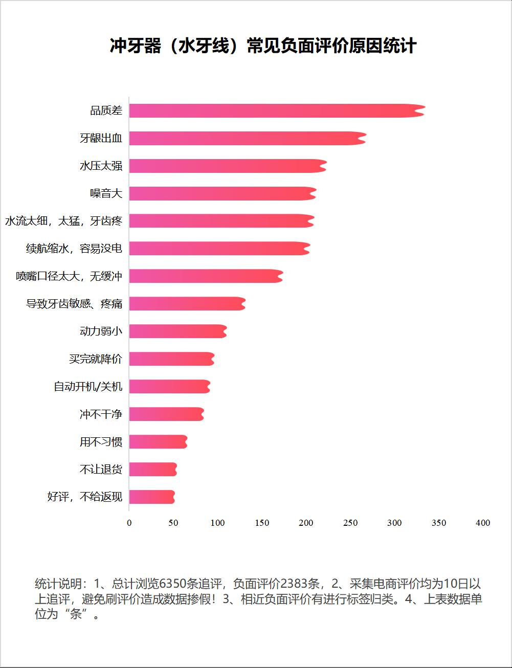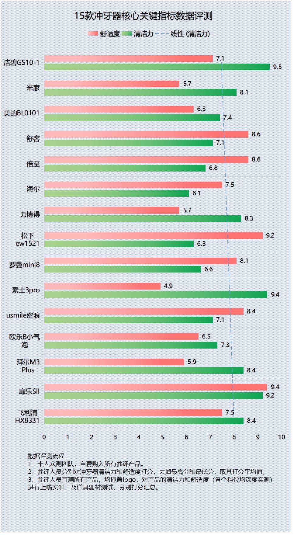 第一条:暴力冲洗不可取,尤其是刚开始使用的时候,一定要采用更温和的方式护理,更温和的水流模式,因为对产品的熟悉需要点时间,牙齿牙龈适应也需要时间,所以不能追求高强度的冲击水流。很多品牌虽然打着护龈护牙的旗号,其实伤牙率并不低,网上吐槽伤牙的情况也很多。下图是我从媒体截取的一份主流水牙线品牌清洁力与护牙度数据。