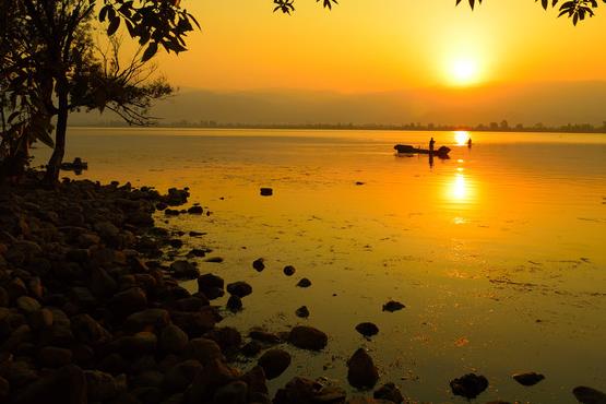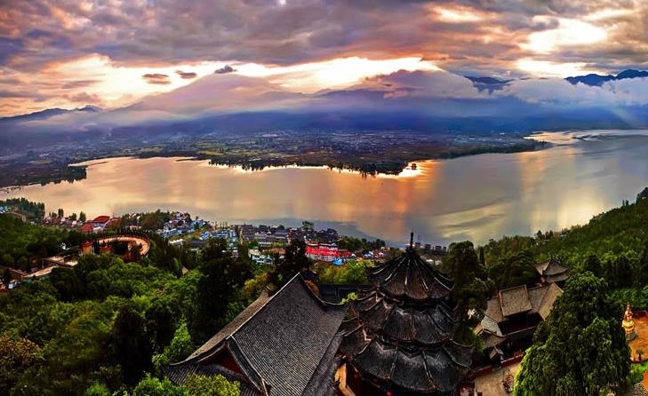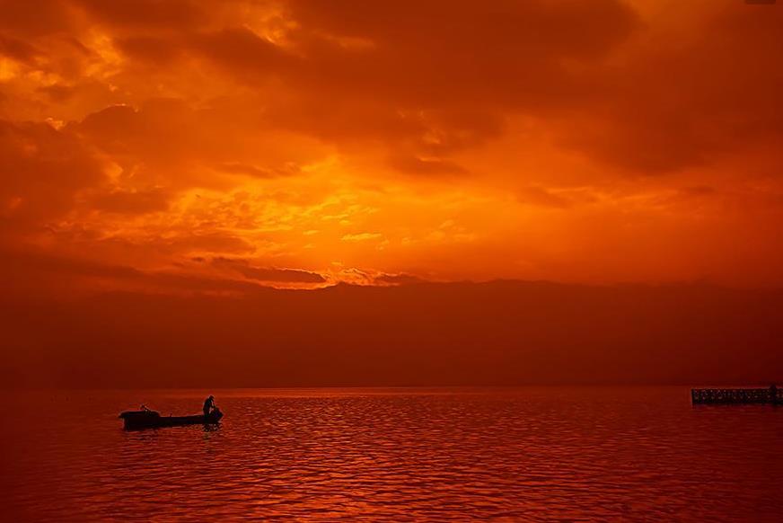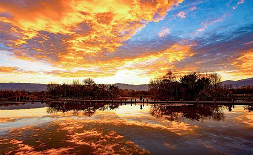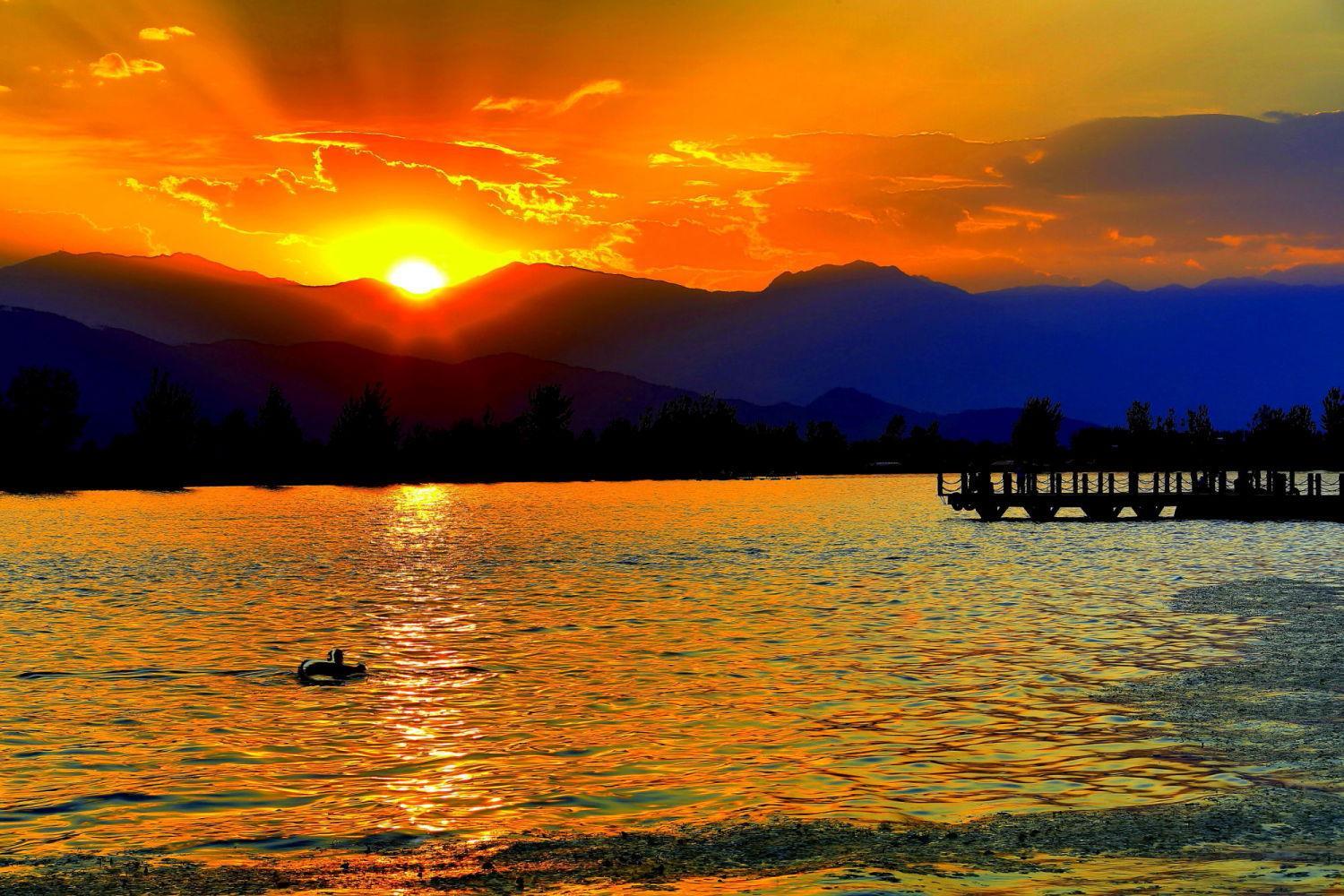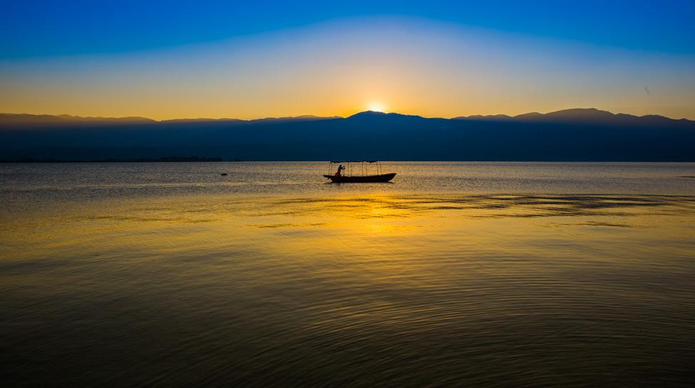 邛海之美,美在浓墨重彩的晨昏。不管是日出还是日落,由于空气澄澈通透,朝阳和夕阳的灿烂将湖水染成一池红艳、满湖金光,犹如彩霞铺满了水面。