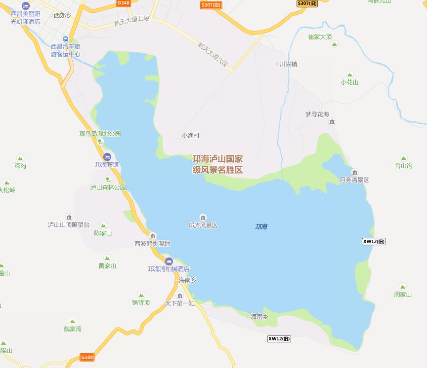 邛海距西昌城东南5公里,是一个高原湖泊。《汉书·地理志》记载:汉代名邓池泽,又名邛池或邛河,后名邛海。邛海面积约31平方公里,状如出壳的蜗牛。