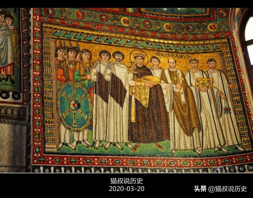 2.《查士丁尼皇帝及扈从》不会出现在景教里。与前面一样,他们继续往寺庙里走,镜头中又出现了一副壁画,作品中间是一位相貌堂堂的皇帝,在其左右站立着几位仆人,一字摆开。同样,这幅画也不是来自于波斯,也是意大利的作品。画作完成于公元547年,表面上看,时间是没有问题的,不过,这个错误不是时间,而是人物。