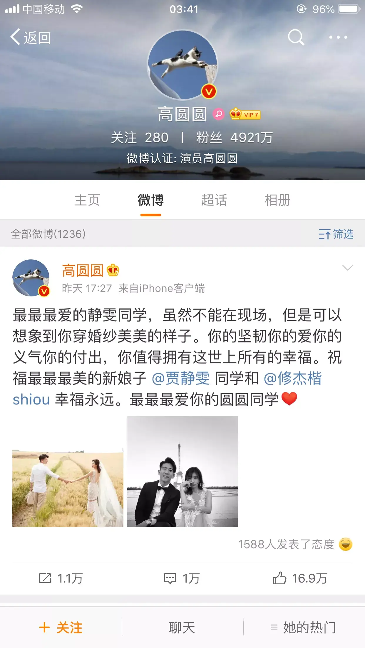 网曝高圆圆 将缺席贾静雯 与修杰楷shiou 的婚礼,隔空送祝福:你值得拥有世界上所有的幸福